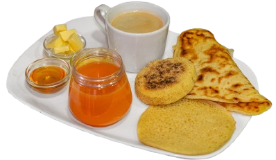 Boisson chaude, Msemen, harcha, miel, beurre, fromage, jus de fruits frais