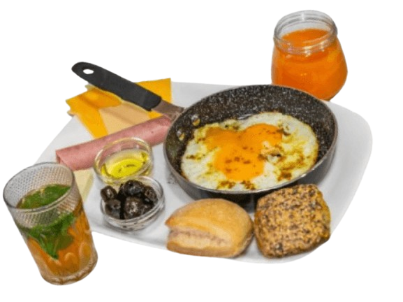 Boisson chaude, œufs au plat ou omelette, fromage, olives noires, huile d’olive, jus de fruits frais