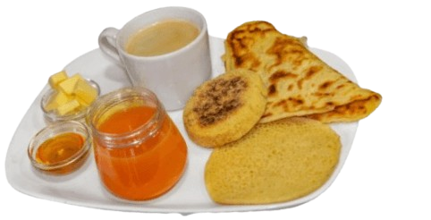 Boisson chaude, Msemen, harcha, miel, beurre, fromage, jus de fruits frais
